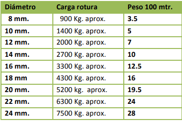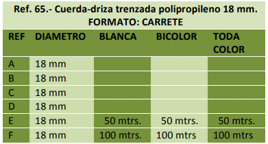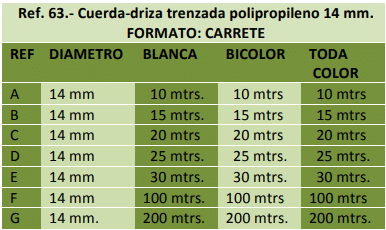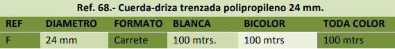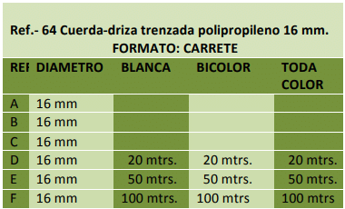 Trenzado exterior de multifilamento de polipropileno en 24 - 32 - 48 husos, alma interior del mismo género o Pter. textil.